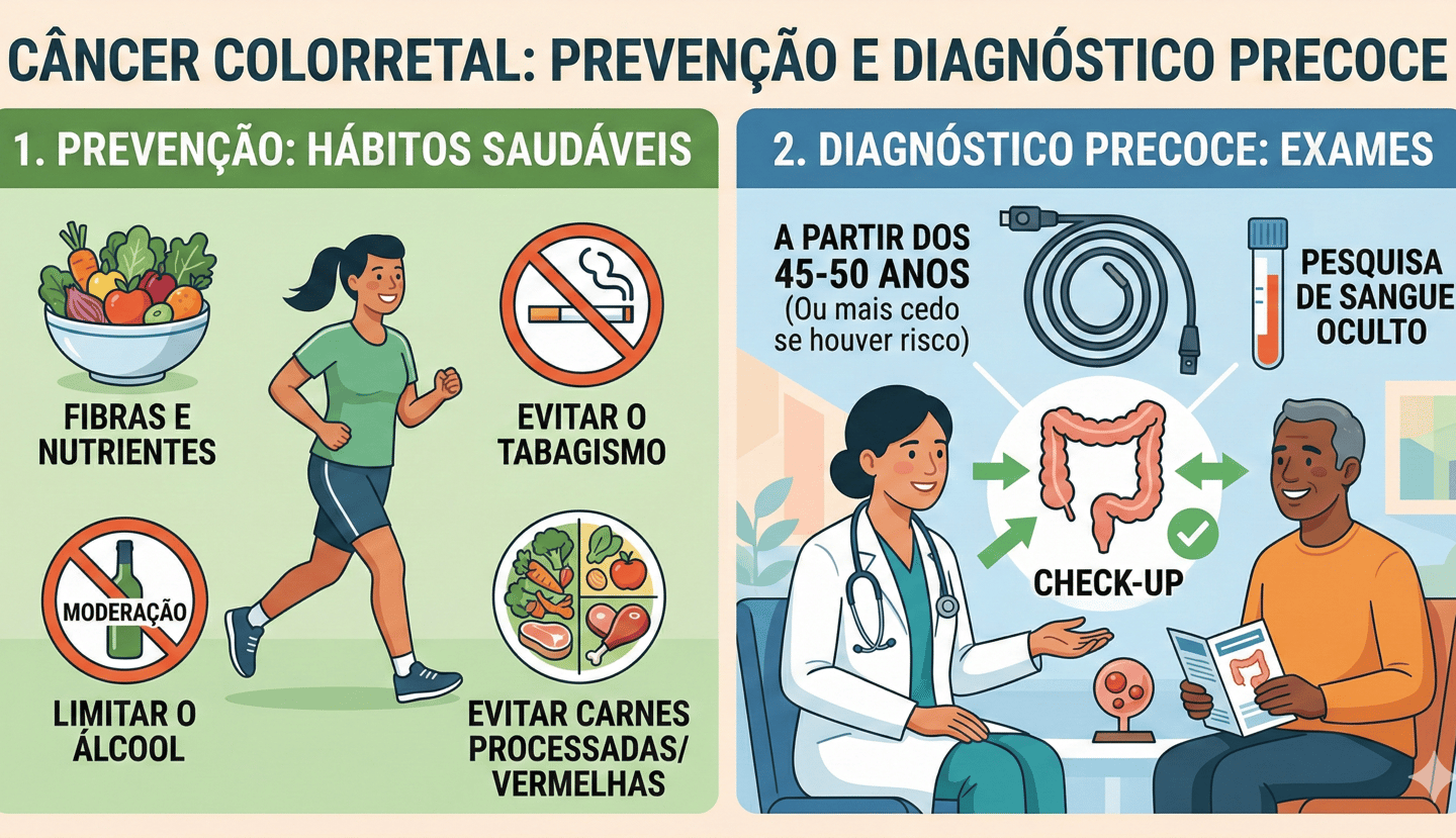 O câncer colorretal (que inclui câncer de cólon e reto) é um dos mais comuns — e a boa notícia é que muitos casos podem ser prevenidos. Prevenir aqui não é só “ter sorte”: é agir antes, principalmente com rastreamento e hábitos de vida que reduzem risco.